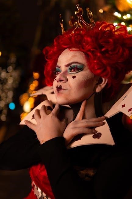 The Red Cross Nurse is a pivotal character, overseeing Alfred’s care while embodying a dual role as the Queen of Hearts. Her transformation highlights the blurred lines between reality and fantasy, showcasing her complexity. As the Queen of Hearts, she brings authority and wonder, symbolizing escape from war’s hardships. Her role underscores themes of power and resilience, making her a compelling figure in Alice’s journey, bridging the real and imaginative worlds with depth and nuance.